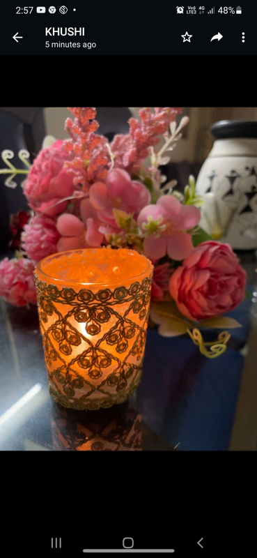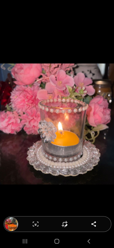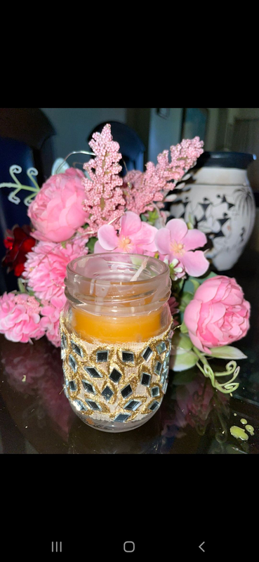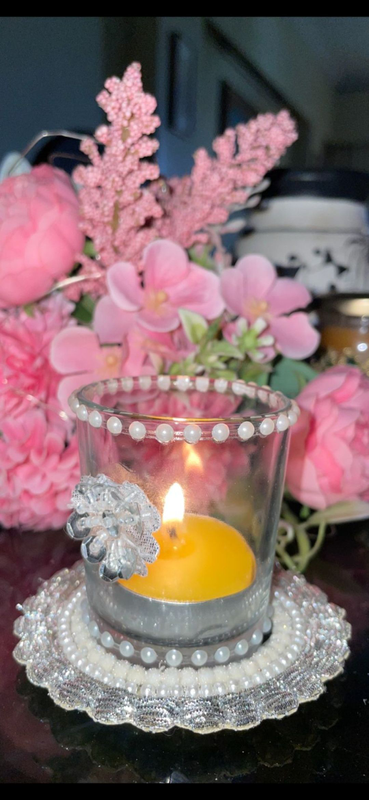 Homemade handcrafted candles reusable with tealights available in lemon grass fragrance, its a glass designed embellished with fabric and pearls. It comes with one lemon grass/ lavender tealight. You can change the tealight and reuse it. It is available in multiple designs and fabrics