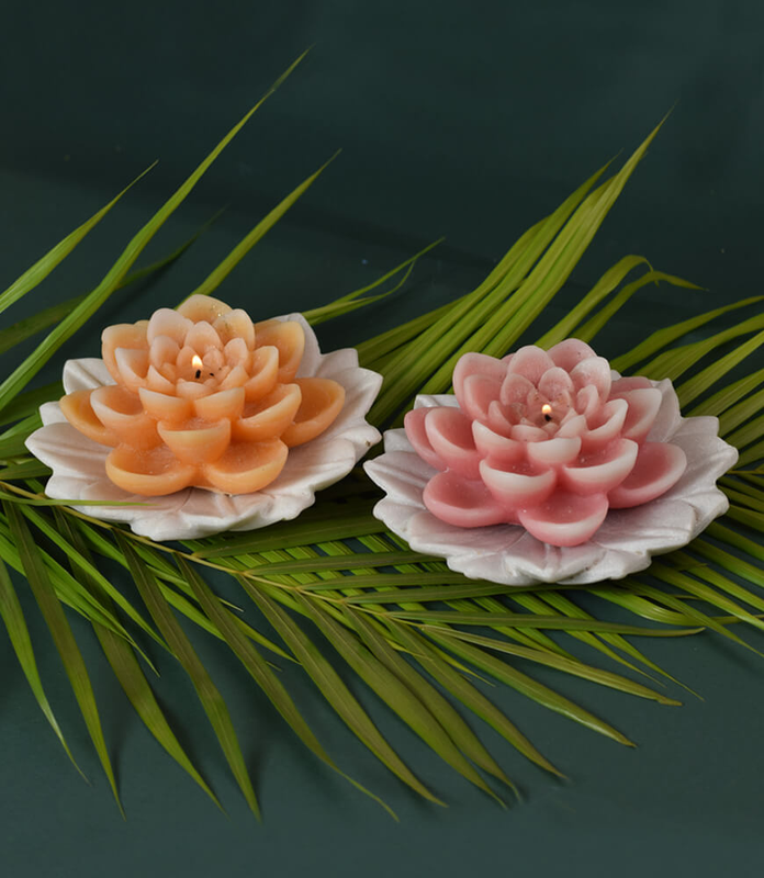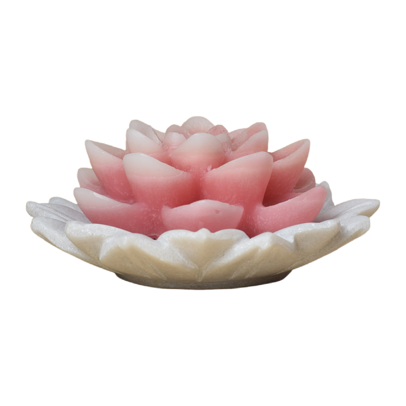 The scented candle is hand poured into a beautiful 5 layered lotus. The wax lotus is placed on a natural hand carved Indian marble bowl. The beautiful pastel pink and orange wax lotus candle has both an aroma and a color palette that enhances up the décor of any room. This decorative candle is hand made and long lasting – making it a vey sustainable and natural choice. The white marble base and the pastel colors contrasts beautifully, making it a very elegant home décor candle. This wax candle is hand poured to achieve this beautiful lotus floral shape. Use this natural handmade candle for home décor to create a soothing ambience. The light fragrance from this lotus candle is a stress reliever. Give the gift of beauty with this fragrant wax candle.