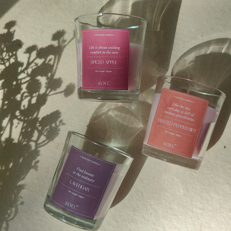 Inhale this pleasant aroma that is sure to put you in a cheerful mood. The labels on the shot glass candles themselves spread good vibes and zen. Our Scented Shot Glass Candles are known not only for aromatherapy but also for some self-motivation. Their scented candles come with motivational quotes and a lovely scent – a perfect recipe for some relaxation. Choose any 4 fragrances from the available options to order for this pack of 4 candles! Following are the fragrances available Vanilla, Lavender, Lemongrass, Balsom Cedarwood, Winter Birchwood, Jasmine, Frosted Juniper, Spiced Apple & Twisted Peppermint. For more visit us at: https://soel.in/store/soel-select/scented-shot-glass-candles-set-of-4/